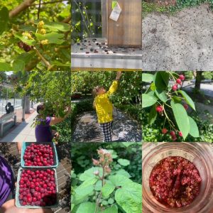 Image Block 2: White mulberries and a few stages of splat, serviceberry harvesting at the bus stop, wineberries ripening and milkweed flower shrub before straining.