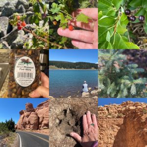Image Block 1: From top left, raspberry, gooseberry and chokecherry from Colorado alpine country; wild pine nuts found in a shop; other fun scenes from the trail.