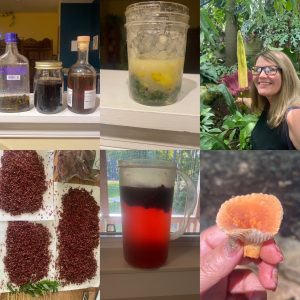 Image Block 2: From top left, three amaros in the making, a pear-shiso shrub, me cheesing with the stinky corpse flower that bloomed at the US Botanic Gardens this month; a massive batch of wild sumac and the resulting sumac-ade; and a lovely, yummy milkcap (cut the gills and taste to make sure the milk is sweet).
