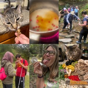 Image Block 2: Ninjette enjoying hen of the woods (and her good fortune to have such a fall bounty on her counter); spicebush berries for a vanilla spice syrup, me posing with a deadly destroying angel on Candise’s mushroom walk, and the intrepid blind athletes smelling “interesting” mushrooms and surviving the stream crossing I put them through.