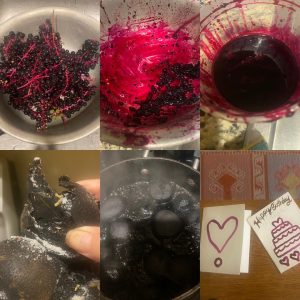 Being an impatient forager, within moments of cooking, I dipped my paintbrush into one of the crushed black hulls to test the waters. The recipe said to simmer for a good eight hours, but less than eight minutes in, the pigment was already dark enough to pen a greeting card!