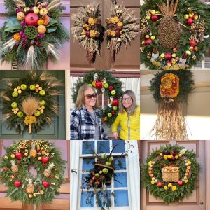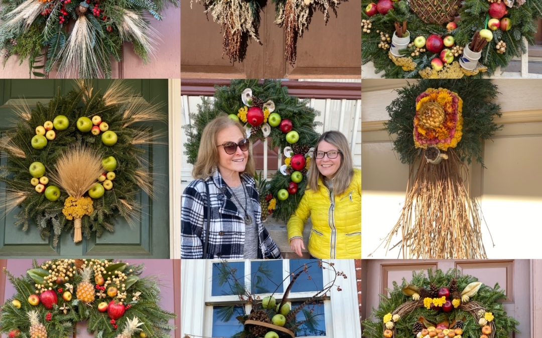 Image Block 1: My mom and I enjoying botanical wreaths in Colonial Williamsburg — a holiday treat! To keep the look authentic, the town only allows natural materials that were available in the 1700s to be used; frequently used materials included apples, cardoon, pomegranates, pine, pineapple, polypores,  oyster shells, wheat and yarrow.