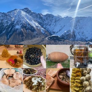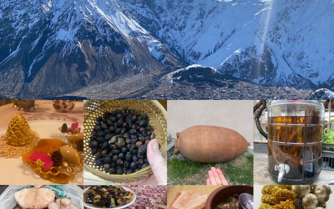 Image Block 2: The Causasus Mountains offered stunning scenery, while wild and hand-gathered foods like pine cones, rose hips, mushrooms, and flowers like marigold and the endemic Caucasian bladdernut were highlights of the Georgian table. One of the most ancient foraged plants is the grape, with over 500 varietals still surviving today. The clay qvevri fermentation vessel has been used to make wine in Georgia for at least 8,000 years).